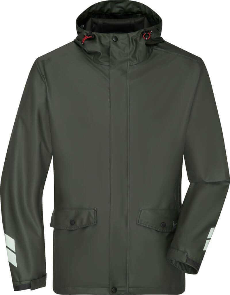 60% Polyester, 40% Polyurethan. Wind- und wasserabweisend (Wassersäule 10 000 mm), Kapuze mit Weitenregulierung, Weitenregulierung am Saum, Weitenregulierung an den Ärmelbündchen mit Klettverschluss, YKK-Reißverschlüsse, 2 Seitentaschen mit Patten und Druckknöpfen, verschweißte Nähte, reflektierende Elemente (ohne Schutzfunktion).