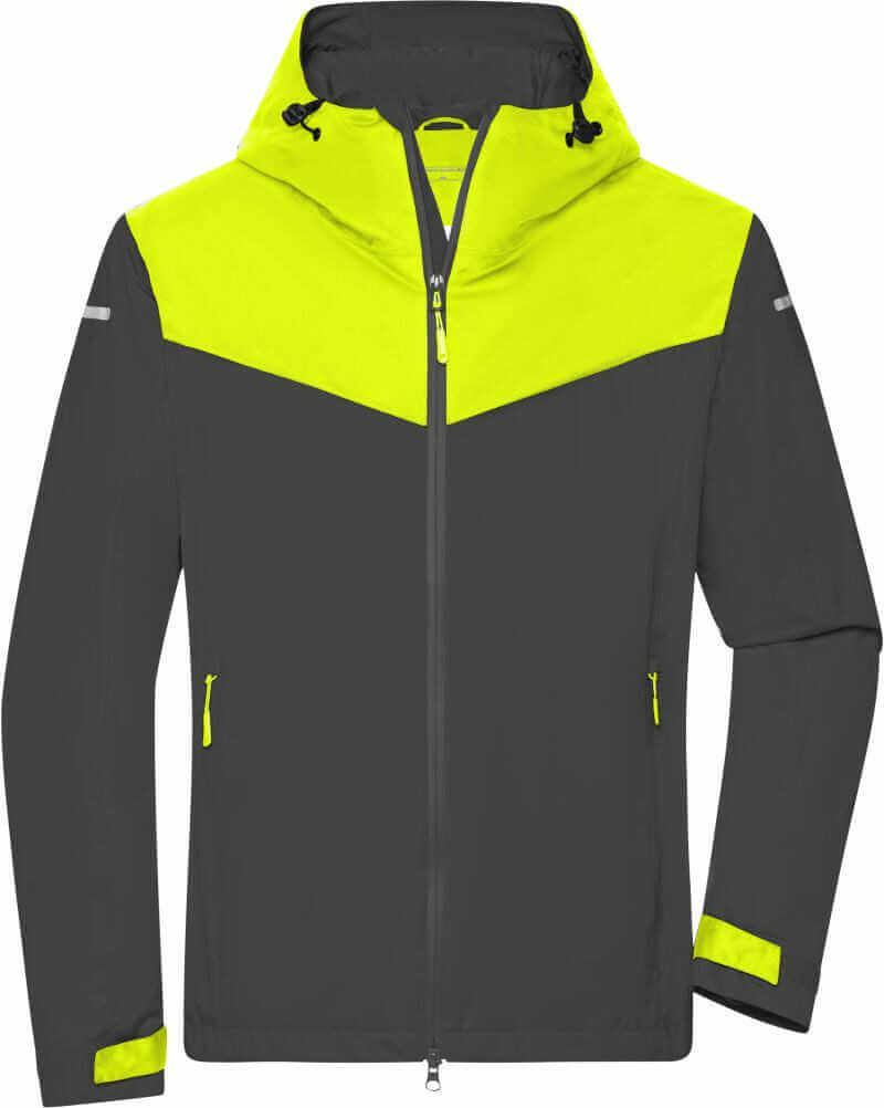 92% Polyester, 8% Elasthan, Mittelschicht: 100% Polyester, Innen: 100% Polyester, 3-Lagen Funktionsmaterial mit PU-Membran, Wind- und wasserdicht (5.000mm Wassersäule), atmungsaktiv (2.000g/m² in 24h), abzippbare gefütterte Kapuze mit mehrfacher Weitenregulierung, unterlegter Frontreißverschluss mit Kinnschutz, taillierter Schnitt