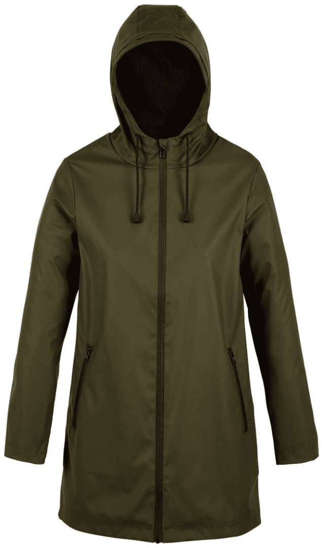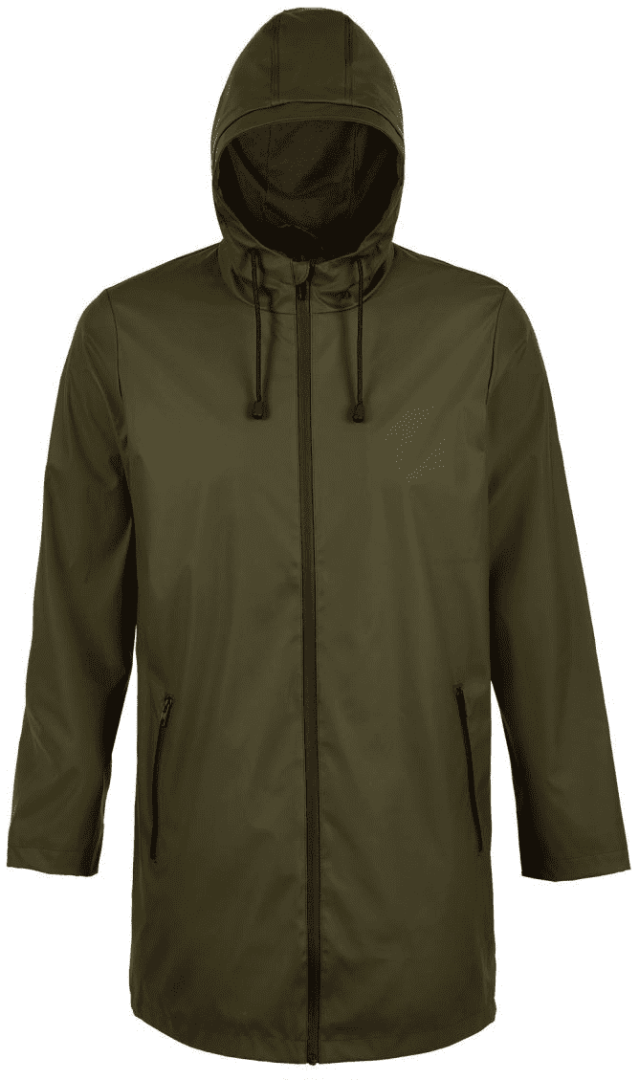 Polyester 220, PU-Beschichtung, Futter aus Polyester-Taft 210T, TC-Kapuzenfutter | Wasserdicht 5.000 mm | Wasserdichter Reißverschluss | Kapuze mit Kordelzug | 2 wasserdichte Seitentaschen mit Reißverschluss | Verlängerter Rücken | Doppelt verschweißte Nähte | Kein Etikett.