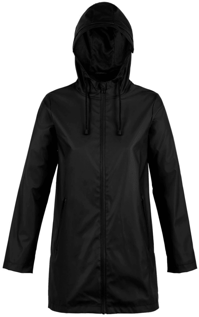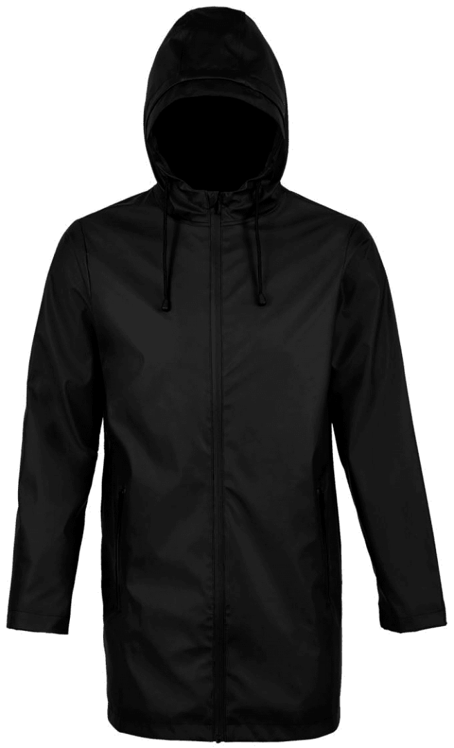 Polyester 220, PU-Beschichtung, Futter aus Polyester-Taft 210T, TC-Kapuzenfutter | Wasserdicht 5.000 mm | Wasserdichter Reißverschluss | Kapuze mit Kordelzug | 2 wasserdichte Seitentaschen mit Reißverschluss | Verlängerter Rücken | Doppelt verschweißte Nähte | Kein Etikett.