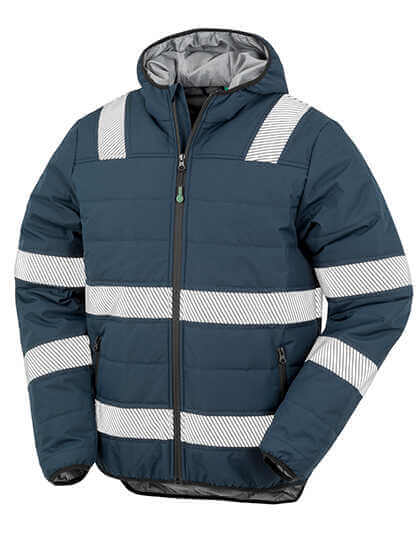 Außenmaterial: 100% recyceltes Polyester-Ripstop mit TPU, Füllung: 100% recyceltes Polyester REPREVE® 200g/m², Futter: 100% recyceltes Polyester | Dauerhaft wasserabweisende Oberfläche | Atmungsaktiv | Winddicht | EN ISO 20471:2013+A1:2016 Klasse 2 | RIS-3279-TOM Klasse 2 (nur orange) | Dunkelblau: | YKK-Frontreißverschluss mit Kinnschutz und Reißverschlussschlaufe | Elastischer Saum, Saum, Ärmelbündchen und Kapuze | Geformtes, längeres Rückenteil | Bedruckte Sicherheitsbänder | Vordertaschen mit Reißverschluss | Gepolsterte Kapuze | Innentasche | Aufhängeschlaufe | Abriebfestes, funktionelles, recyceltes Ripstop-Außenmaterial mit funktioneller, recycelter REPREVE®-Füllung aus umweltfreundlichen Materialien, die aus recycelten Plastikflaschen und Industrieabfällen hergestellt wurden | PFOA-frei | Recycelbare Materialien am Ende der Lebensdauer | Zugang zum Dekorieren: Innenseite der linken Brust und des Rückens | Vorbereitet für Branding | Polybeutel ist biologisch abbaubar | Hergestellt aus 23 (1-Liter-) Plastikflaschen | Hersteller garantiert reflektierende Eigenschaften gemäß EN-Normen für 25 Wäschen bei 40 °C.