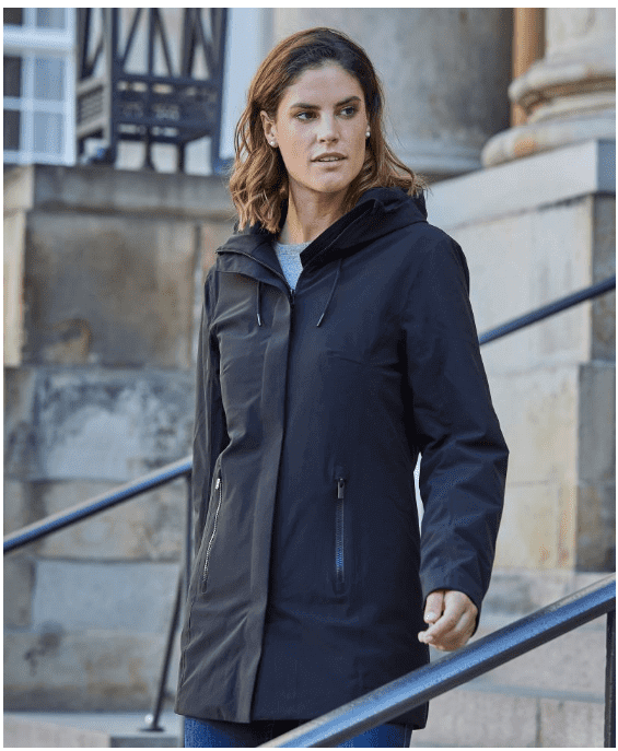 Damen-Allwetterjacke aus 88% Polyester, 12% Elasthan, doppellagiges Gewebe mit 310T-Polyester-Futter mit DuPont™-Wattierung, verstellbare Kapuze, Magnetknöpfe und praktischer 2-Wege-Frontreißverschluss, vordere Reißverschlusstaschen mit warmem Futter, moderne längere Länge und Damenschnitt, wind- und wasserdicht (8.000 mm), verschweißte Nähte, atmungsaktiv (3.000 g/m² in 24 Stunden).