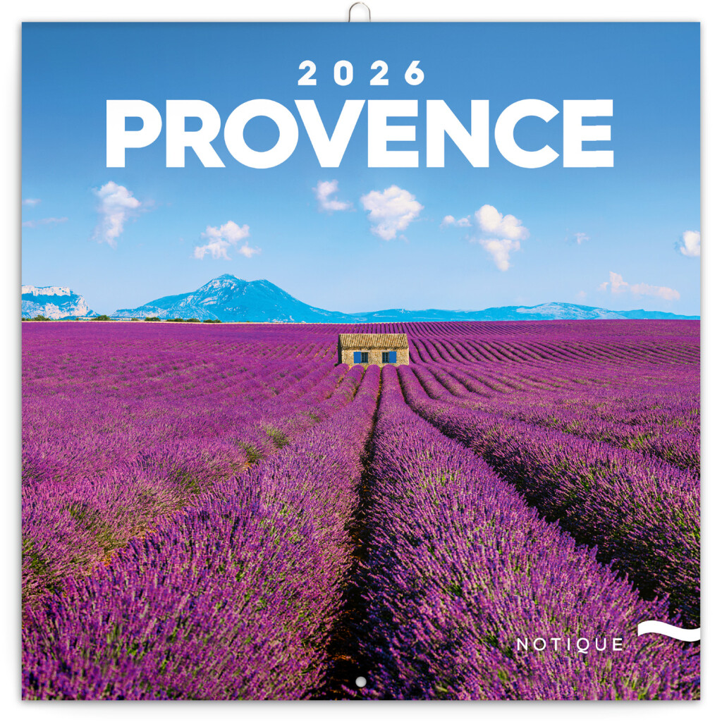 Zwölf Fotografien der berühmten Lavendellandschaft der Provence in einem Notizkalender in sechs Sprachen. Neben den Fotografien enthält das Kalendarium ein übersichtliches Kalendarium von September 2025 bis Dezember 2026 in sechs Sprachen, die Phasen des Monats, wichtige Feiertage und Platz für Notizen zu jedem Tag.