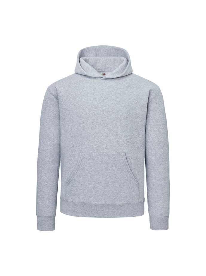 Klassischer Schnitt, gefütterte Kapuze mit Teilungsnähten und Kordel, Kängurutasche, innen angeraut, neutrales Größenlabel, 30° waschbar.