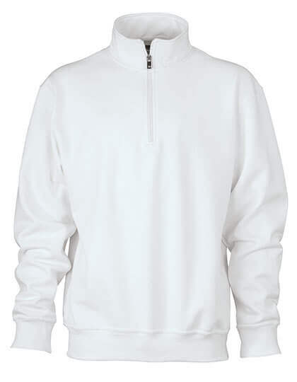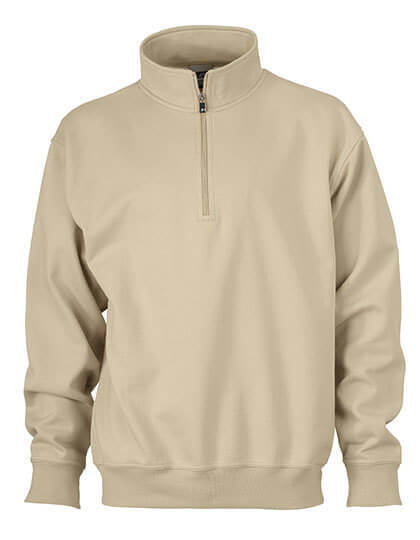 290g/m², 70% Baumwolle, 30% Polyester, Stehkragen, 2 Seitentaschen mit verdecktem Reißverschluss, elastische Rippbündchen an Arm und Bund, 60° waschbar, trocknergeeignet