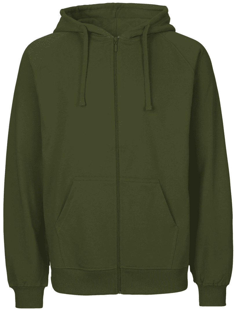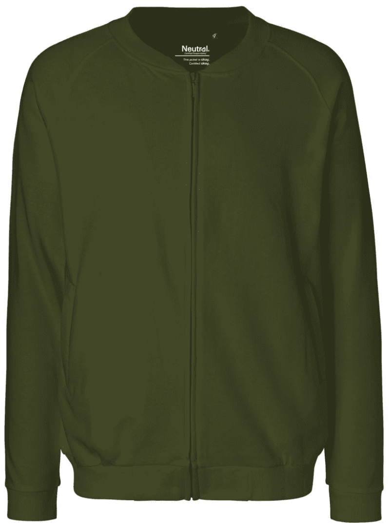 Nackenband, Raglanärmel, Rippenbündchen an Ärmeln und Saum, verdeckter YKK-Reißverschluss, 2 Seitentaschen, aufgeraute Innenseite