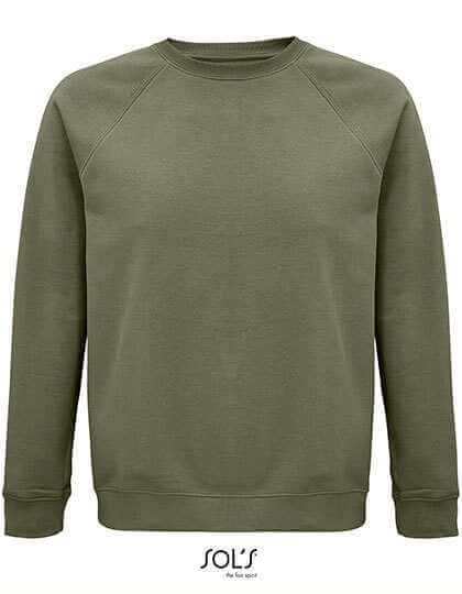 Fleece 280 | 80% Bio-Baumwolle/20% recyceltes Polyester | 3 Fäden | Gekämmte Innenseite | Außen: 100% Baumwolle, gerippt: 97% Bio-Baumwolle/3% Elasthan | Bio-Rundhals-Sweatshirt | Seitennaht | Raglanärmel | Halbmond-Innenausschnitt | Jersey-Druckknopfbänder | 2x2 Rippenbündchen an Ärmeln, Kragen und Saum | Kein Etikett