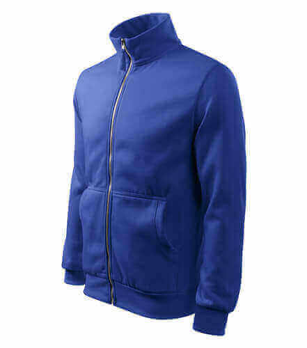 290g/m², 70% Baumwolle, 30% Polyester, Stehkragen, 2 Seitentaschen mit verdecktem Reißverschluss, elastische Rippbündchen an Arm und Bund, 60° waschbar, trocknergeeignet