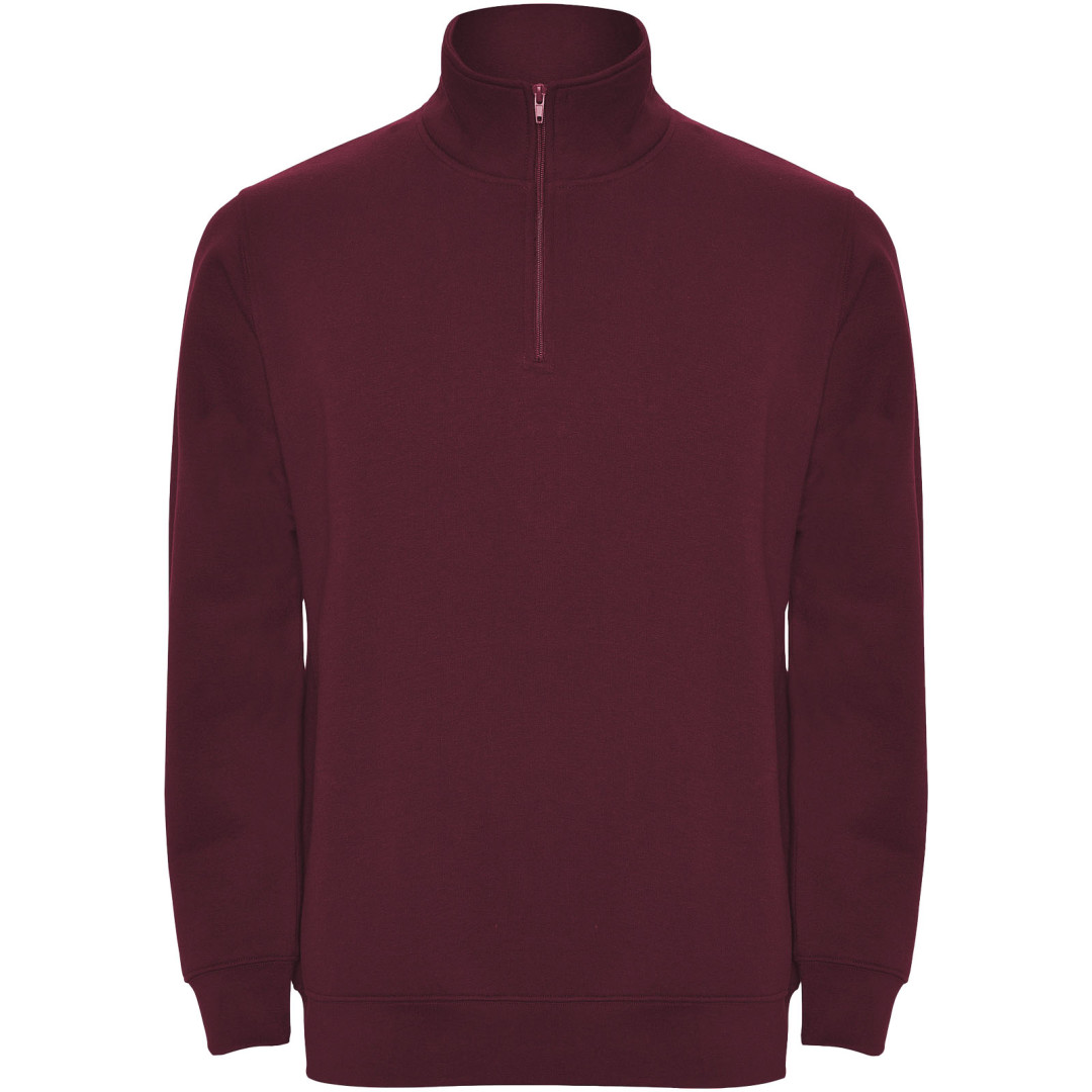 Sweatshirt mit dem gleichen halben Reißverschluss und halben Ausschnitt. Passender Innenkragen. Verstärkte verdeckte Nähte am Innenkragen. Bündchen und Taille mit 1x1-Rippstrick. Das Model ist 185 cm groß und trägt Größe M.