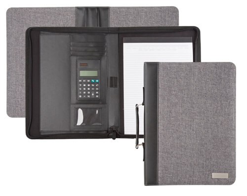A4 Dokumentenmappe mit Reißverschluss, 20-seitigem Notizblock, solarbetriebenem Rechner und Metallplate. Material: Kunstleder und Leinen.