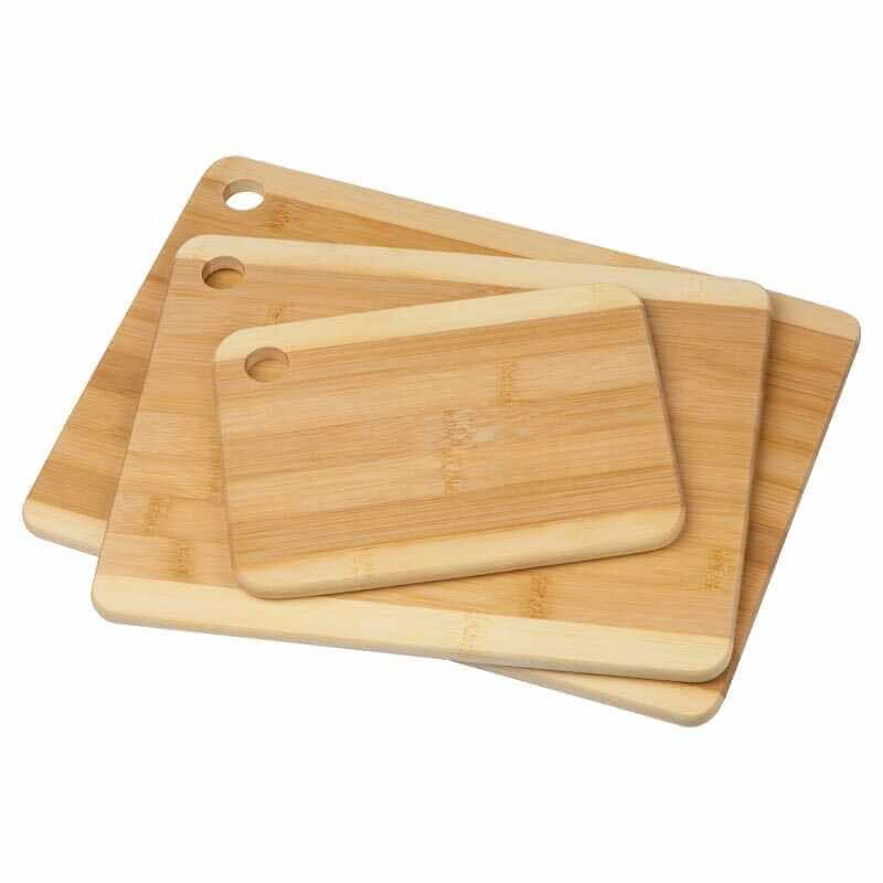 Set aus drei Bambus-Schneidebrettern in verschiedenen Größen mit abgerundeten Ecken und einem Loch in der Ecke.