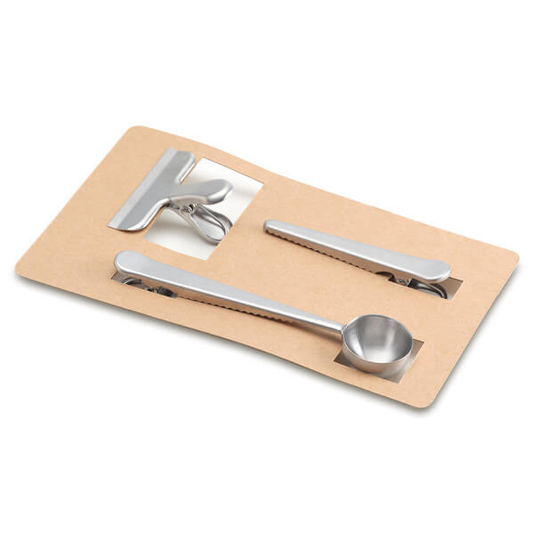 Set aus Edelstahl, bestehend aus einem Messlöffel und Clips, die die Verpackung nach dem Öffnen schützen. Länge des Löffels 17 cm, Fassungsvermögen 7 g; langer Clip 12 cm, kurzer Clip 8 cm. Praktisches Zubehör, das in jeder Küche nützlich ist.