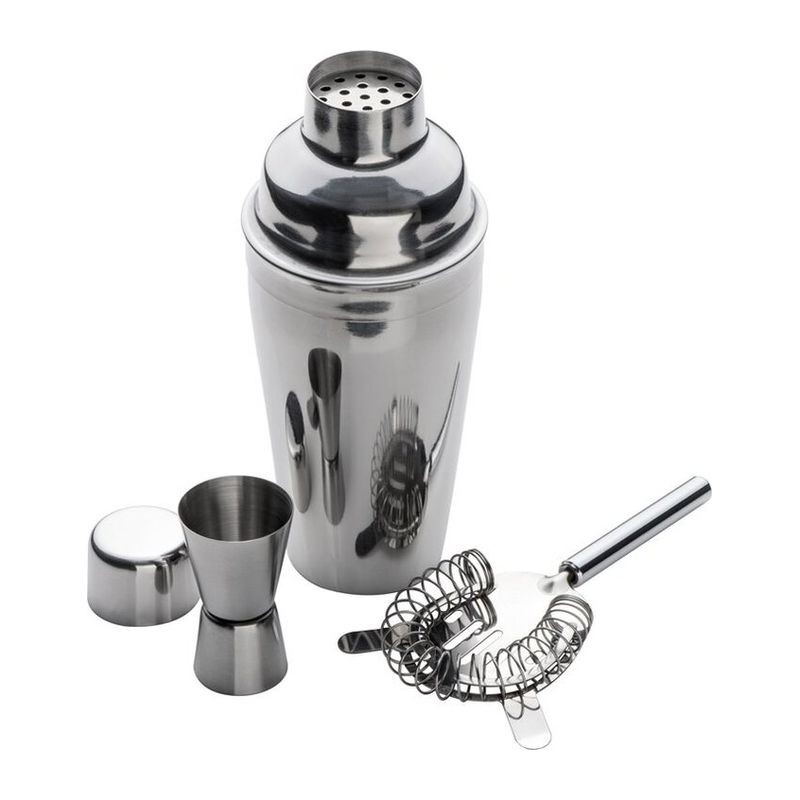 Hochwertiges verchromtes Cocktail-Set, bestehend aus einem Messbecher, einem Shaker und einem Barkeeper-Sieb.
