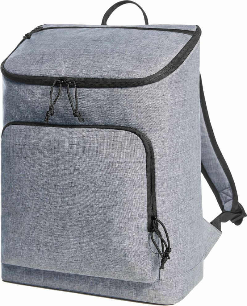 Material: 300D Polyester, PVC-frei. Abdeckklappe mit umlaufendem 2-Wege-Reißverschluss an drei Seiten, Tragegriff, verstellbare und gepolsterte Schultergurte, voll isoliertes Hauptfach, gepolsterter Rücken, Netzfach mit Reißverschluss für Kühlboxen, große Fronttasche mit 2-Wege-Reißverschluss, Größe: 30x42x15cm.