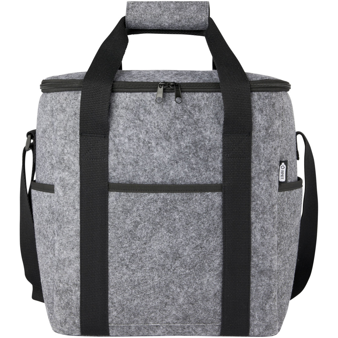 Große Kühltasche aus hochwertigem, weichem und langlebigem Recycling-Filz mit GRS-Zertifizierung. Enthält ein großes Hauptfach (sechs 1,5-Liter-Flaschen) mit lebensmittelechter und extra dicker PEVA-Isolierung mit hoher Wärmedichte, um Getränke und Snacks über lange Zeit kalt zu halten. Reißverschluss oben, Fronttasche und zwei Seitentaschen für zusätzlichen Stauraum. Verstellbare lange Schultergurte aus Baumwollgewebe (55 x 3,8 cm) und 2 Griffe aus Baumwollgewebe (25 x 3,8 cm) mit Klettverschluss oben. Leicht zu reinigen. Fassungsvermögen: 21 Liter.