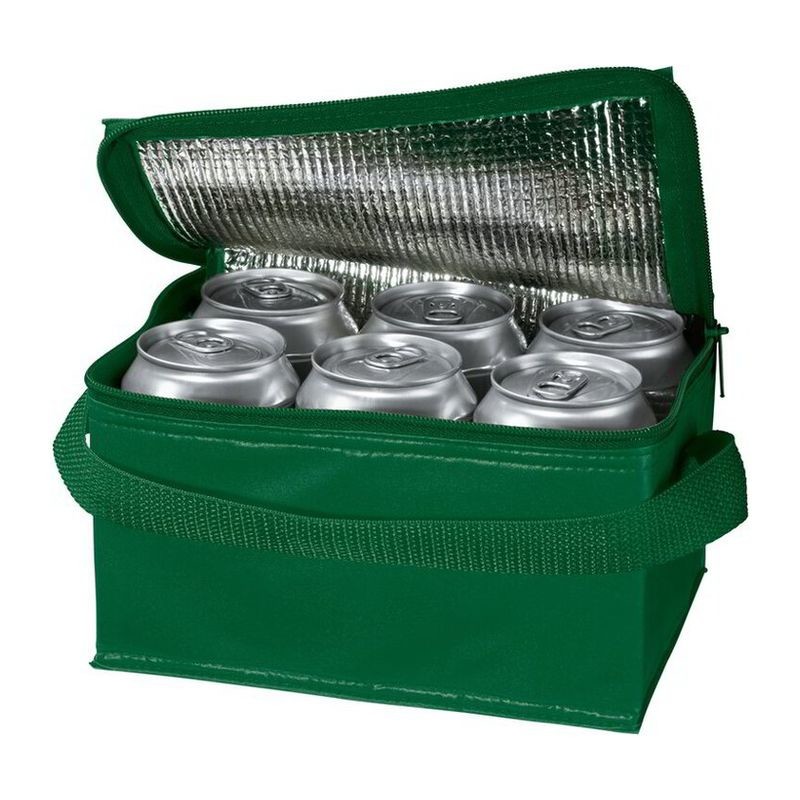 Praktische Kühltasche aus Polyester, mit Reißverschluss und Platz für 6 Dosen mit einem Volumen von 330 ml.