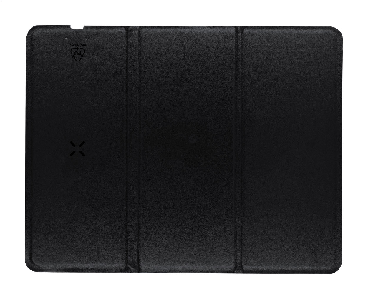 Foldable mouse pad made of recycled PU leather with built-in wireless charger (10W) and mobile phone holder function. With velvet anti-slip base. USB charging cable included.