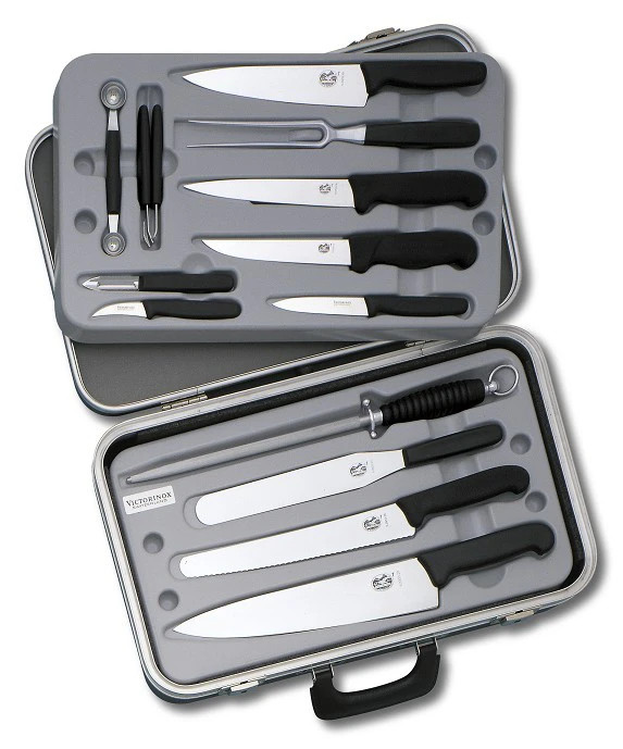 Súprava nožov v uzamykateľnom kufríku 17-dielna s polypropylénovými rukoväťami. Súprava pozostáva z 2 ks kuchárskych nožov, cukrárskeho noža, podberačky, ocieľky, lúpacieho noža, škrabky na zemiaky, vykrajovača s 2 naberačkami, 2 ks dekoračných nožov, špikovacieho noža, vykosťovacieho noža, filetovacieho noža, vidlice, kufríka a 2ks vložiek. Súprava obsahuje: 1. kuchársky nôž 5.2003.28 2. cukrársky nôž 5.2933.26 3. podberačka 5.2603.23 4. ocieľka 7.8403 5. lúpací nôž 5.3103 6. škrabka na zemiaky 5.0103 7. vykrajovač s 2 naberačkami 7.6163 8. dekoračný nôž na citrusy 5.3403 9. dekoračný nôž na citrusy 5.3503 10. špikovací nôž 5.0703 11. vykosťovací nôž 5.6003.15 12. filetovací nôž 5.3703.18 13. kuchynská vidlica 5.2303.18 14. kuchársky nôž 5.2003.19 15. kuchársky kufrík 5.4914.0 16. horná vložka na súčasti 5.4913.1 17. dolná vložka na súčasti 5.4913.2