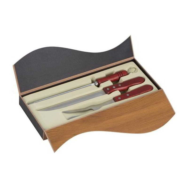 Ein klassisches Set für die Zubereitung von Fleischgerichten, bestehend aus Messer, Gabel und Messerschärfer mit Holzgriff in einer extravaganten Holzbox.