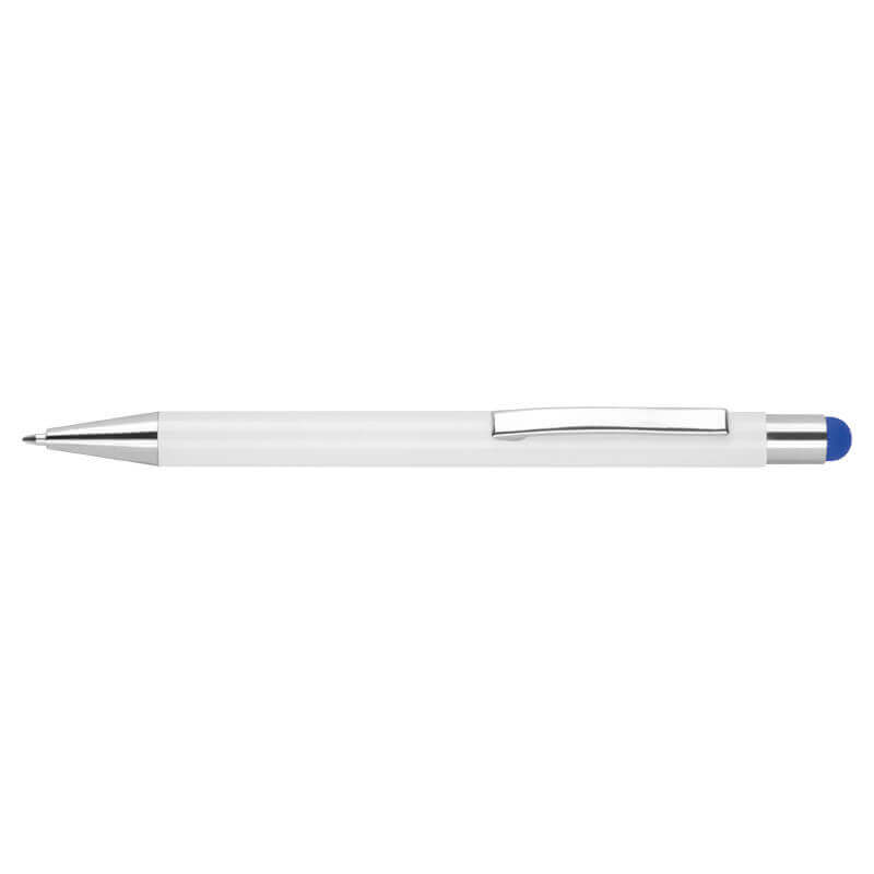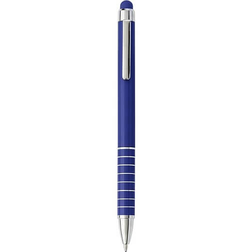 Edelstahlfarbener Kugelschreiber mit blauer Füllung und Drehverschluss zum guten Preis. Über seinem hochglänzenden Clip befindet sich eine Touch-Spitze.