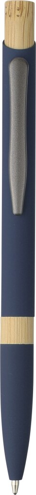 Recycled aluminum ballpen with a rubberized finish, bamboo pusher, and bamboo ring in the body. Features a push mechanism, 1.0 mm nib size, and blue ink with an approximate writing length of 800 meters. Includes an engraved recycled aluminum logo. Dimensions: 14 x 1 x 1,5 cm