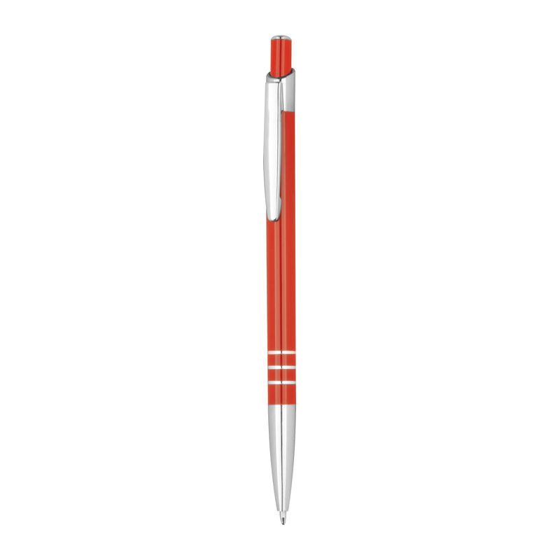 Aluminiumkugelschreiber mit 3 dekorativen Ringen. Der Stift hat eine große blaue Füllung. Wir empfehlen das Gravieren als Druck.