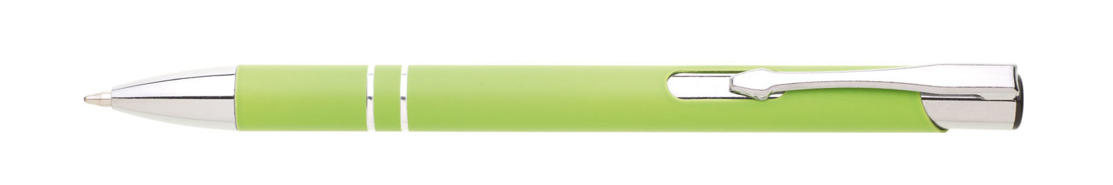 SIONA SOFT aluminum ballpoint pen with silver accessories and a colorful soft rubberized surface. Blue high-volume refill. High-capacity