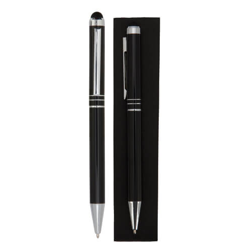 Kovové guličkové pero 2v1 a pero bez atramentu v čiernej darčekovej krabičke. S modrou náplňou a špičkou z kovovej zliatiny, ktorá oxiduje papier.