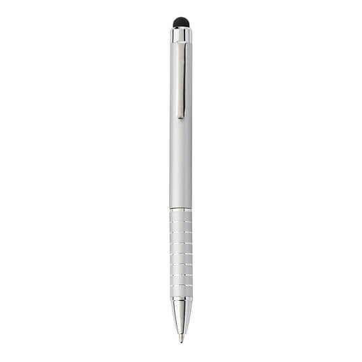 Aluminium-Touch- und Kugelschreiber mit spezieller Oberfläche für Farblaser, mit blau schreibender Mine.