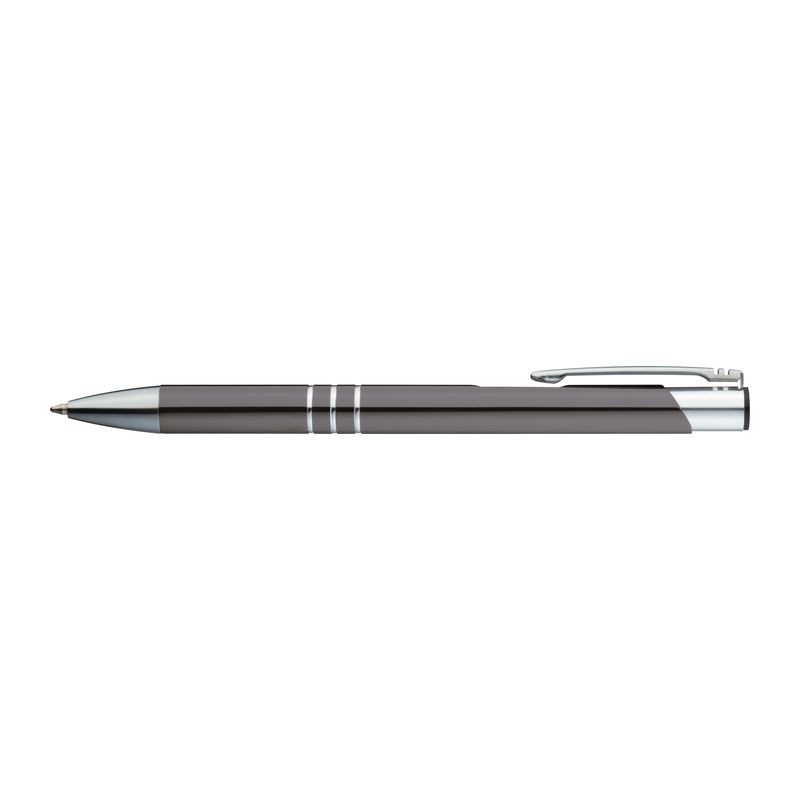 Komplett lackierter Metallkugelschreiber mit 3 Zierstreifen. Der Stift hat eine große blaue Mine.