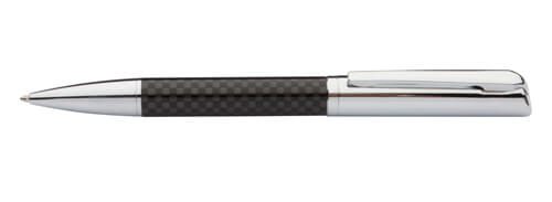 Metallkugelschreiber mit Karbonoptik. In Aluminium-Röhrenetui, mit blau schreibender Mine.