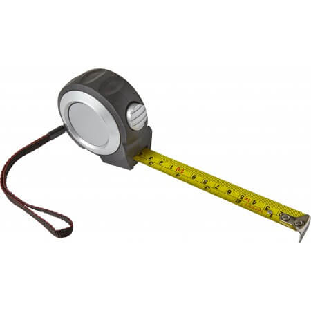 Aluminum tape measure. 3 meters in length. With push button and printed centimeters, including wrist cord. Individually packaged in a brown cardboard box. Dimensions: 26,5 x 30 x 21 cm