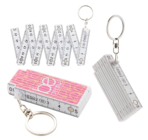 Maßband aus Kunststoff mit Stopper, Metallclip und Schlüsselring.