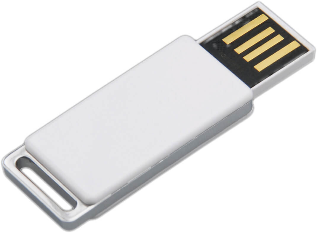 Der praktische USB-Mini-Schlüssel in Weiß, mit der Option, die Spitze jeweils zu befestigen. die Kette. Kapazität: 2GB-64GB