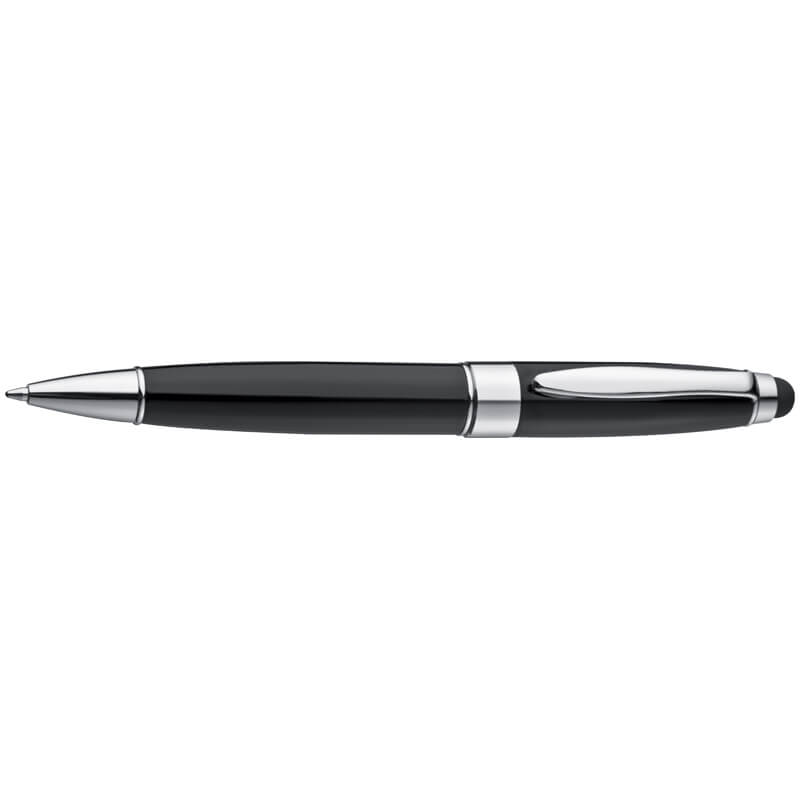 Eleganter Metall-Kugelschreiber mit blauer Schrift auf der einen Seite und praktischer Touch-Funktion auf der anderen Seite zur Steuerung aller modernen Touchscreens. Wir empfehlen das Gravieren.