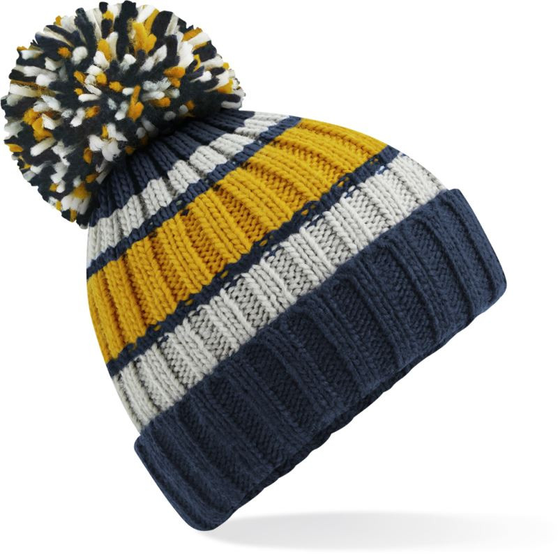 Schwerer Rippstrick, auffälliges dreifarbiges Streifendesign, Rollsaum, luxuriöses Lammfellfutter für zusätzliche Wärme, extra großer Bommel, TearAway-Etikett, Handwäsche, nicht bügeln, nicht im Wäschetrockner trocknen, nicht chemisch reinigen.