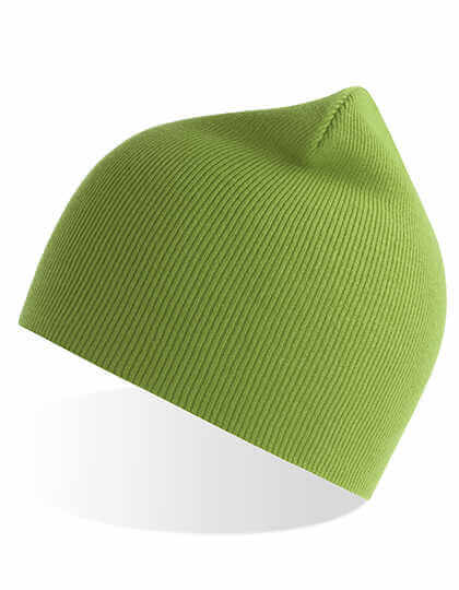 Werbemütze aus nachhaltigen Materialien. Einlagige Beanie-Mütze mit doppelt gefaltetem Rand. Gebrandete Schlaufe.