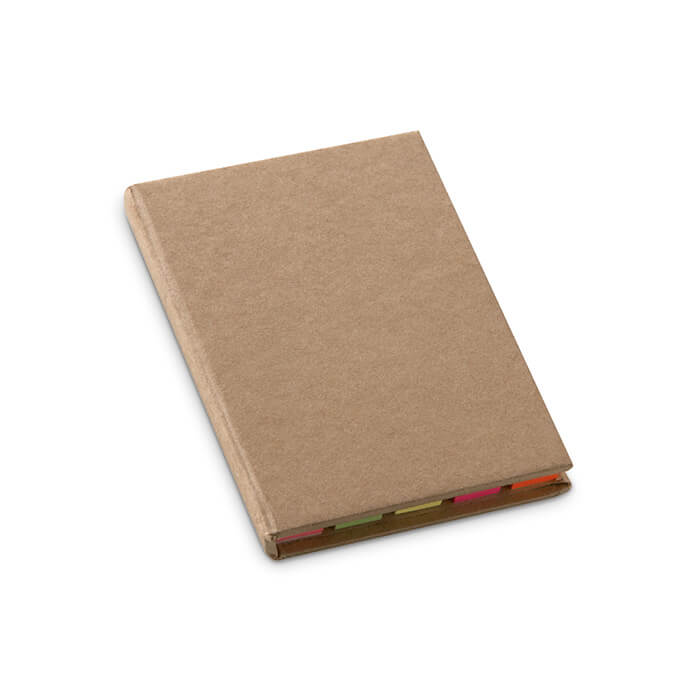 Notepad in cardboard box with elastic closing tape. Comes with a cardboard ballpoint pen with plastic tip and clip. Cover: 2 mm thick cardboard. Inside: 80 g woodfree paper 140 pages. 2x 80 g of yellow sticky note, 5 x set of PET sticky papers of 25 sheets.