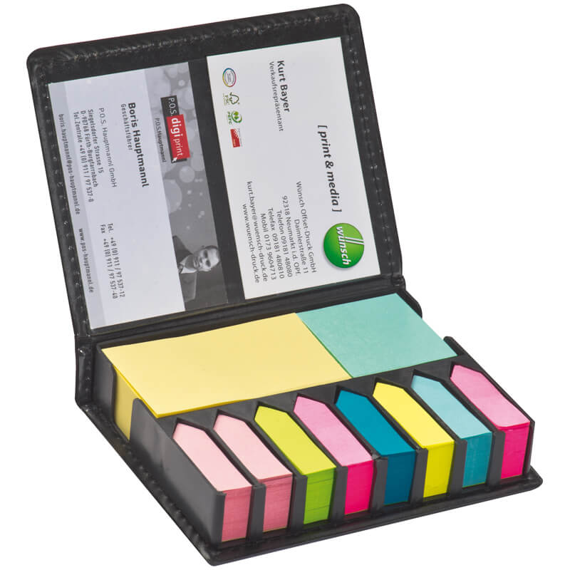 Plastic case holding approximately 1600 self-adhesive memo papers and labels in different colours.
