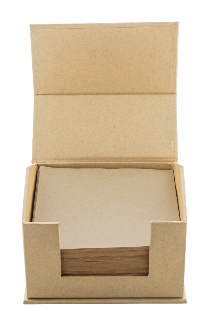 Haftnotizblock aus Karton, mit 6 Sätzen mit jeweils 25 Blatt. Enthält einen Notizblock mit 100 unlinierten Seiten. Einen Kugelschreiber aus Kraftpapier.