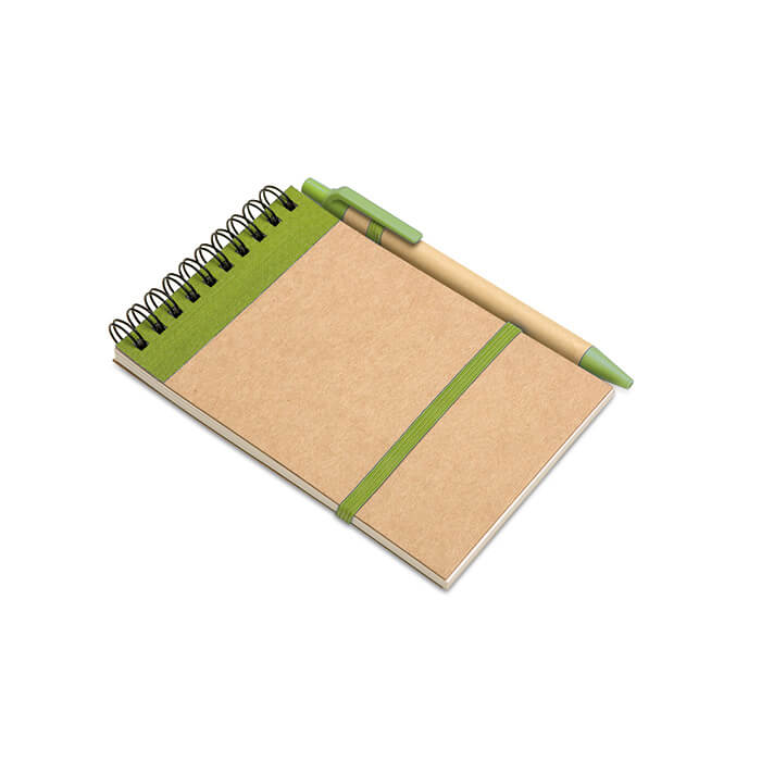 Wire bound notebook with ballpen, with approx. 60 sheets made from 100% recycled paper and a bio fabric coloured material, includes a pen with biodegradable parts, blue ink.