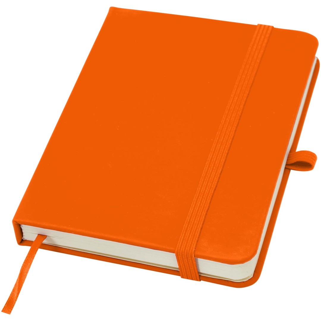 Soft feel notebook (approx. A6) with a PU cover, with 96 lined double sided sheets, ribbon marker and coloured, elastic nylon band for closing.