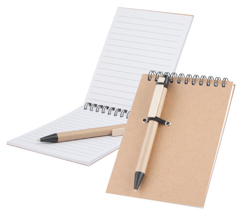 Ökologisches Notizbuch B6 mit Kugelschreiber aus Karton. Sauberes, recycelbares Papier (140 Seiten). Teile aus abbaubarem Kunststoff.