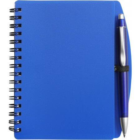 B6 Notizbuch mit 70 leeren Seiten (70 g/m2) mit Kugelschreiber aus recyceltem Material und blauer Mine, elastischer Stiftschlaufe und Metallspirale.