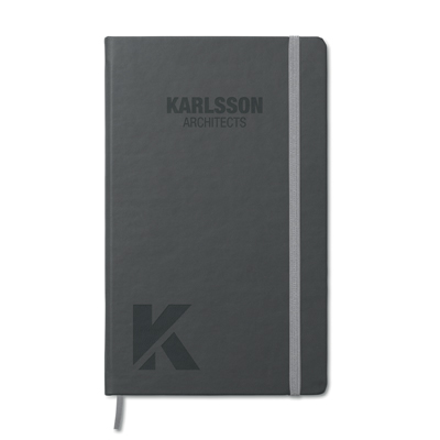 A5 Notizblock mit 160 Seiten und festem PU-Einband. Mit schwarzer Lasche und Kautschukband.
