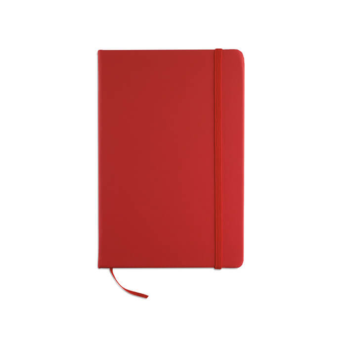 A5-Notizbuch mit PU-Einband, 192 linierten Seiten, Lesezeichen, Gummizug und Stiftschlaufe. Druckverfahren Tampondruck.