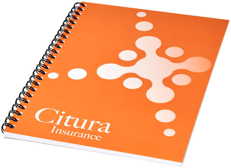 Desk-Mate® A5 Notizbuch mit Kunststoff Cover und Spiralbindung. Desk-Mate® A5 Spiralnotizbuch. Enthält 50 Blatt Blankopapier (80 g/m2) und einen Umschlag (450 g/m2). Der Umschlag ist reiß- und wasserfest. Weiße Spiralbindung. Eine Dekoration ist sowohl auf dem Umschlag als auch auf jedem Blatt möglich. Mindestabnahmemenge 100 Stück. Papier, Polypropylen.