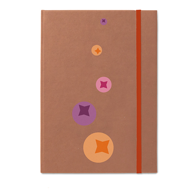 Notizbuch aus Recycling Papier mit 100 Seiten, farbigen Linien und Gummiband.
