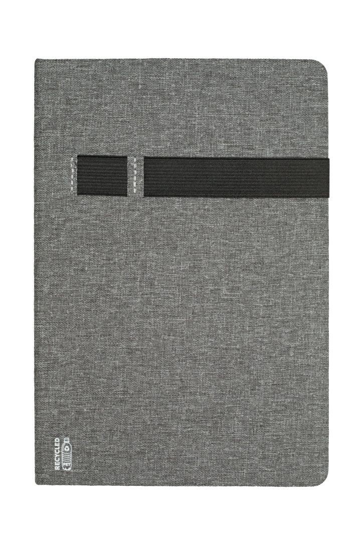 Das A5-Notizbuch mit grauem RPET-Einband hat 80 Seiten. Das Pad verfügt über eine Schlaufe für einen Stift und auch für ein Mobiltelefon. 80 linierte Blätter