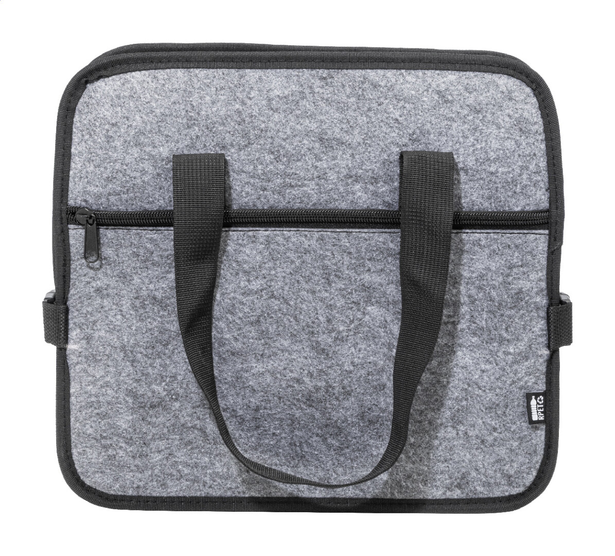 Faltbarer Kofferraum-Organizer aus RPET-Filz mit Reißverschlusstasche vorne, langen Tragegriffen und seitlichen Schnallen für praktisches Verstauen. Enthält ein offenes Staufach und ein Kühlfach mit Reißverschluss und Aluminiumpolsterung. Mit markantem RPET-Etikett. Tragkraft: 8 kg. Volumen: 80 l.